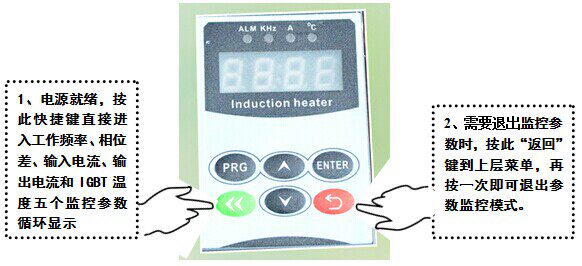 电源和线圈就绪:把软启动端子短接后就启动工作,工作后操作显示器默认显示输入工作电流,建议用钳表测输入电流检查一下输入电流是否在额定电流范围。按一次[快捷]键一次,进入显示工作频率,正常时显示10-20kHz,高于22kHz,说明线圈绕少了,需要增加线圈,低于15kHz,说明线圈多绕了,需减少线圈。再按一次[快捷]键,此时显示相位差,正常时显示00-05,高于08时说明线圈少了,或者保温层可能比较厚,或者线圈间隔可能比较大,需调整。当加热到负载正常生产时的温度时,三个参数需符合标准,机器方能理想工作:一、输入工作电流:(85-100%额定范围内都算正常);二、工作频率:10-20kHz,最好在15kHz左右;三、相位差:00-05之间。